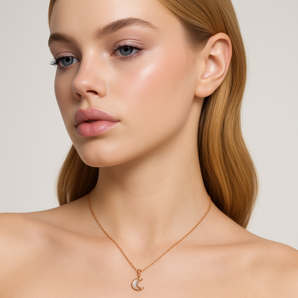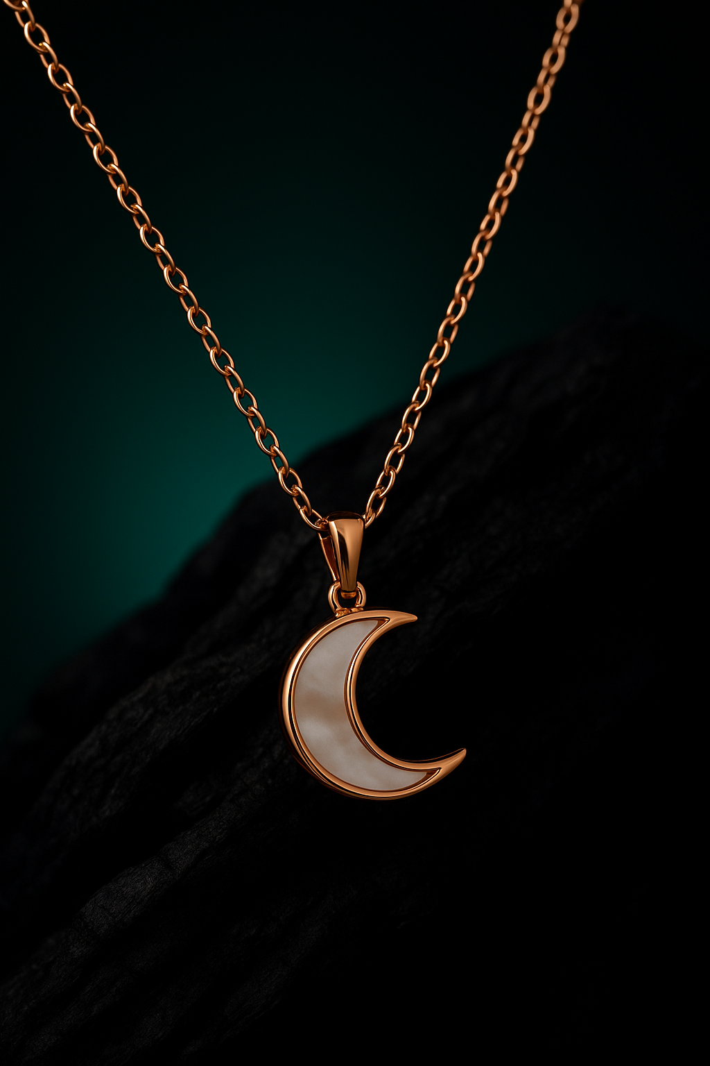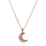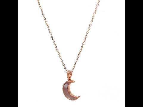 The pendant is suspended from a fine, shimmering sterling silver chain, catching the light with every movement. The inner curve of the crescent showcases a luminous inlay of mother-of-pearl, which offers a soft, ethereal glow that perfectly complements the warm rose gold tone.