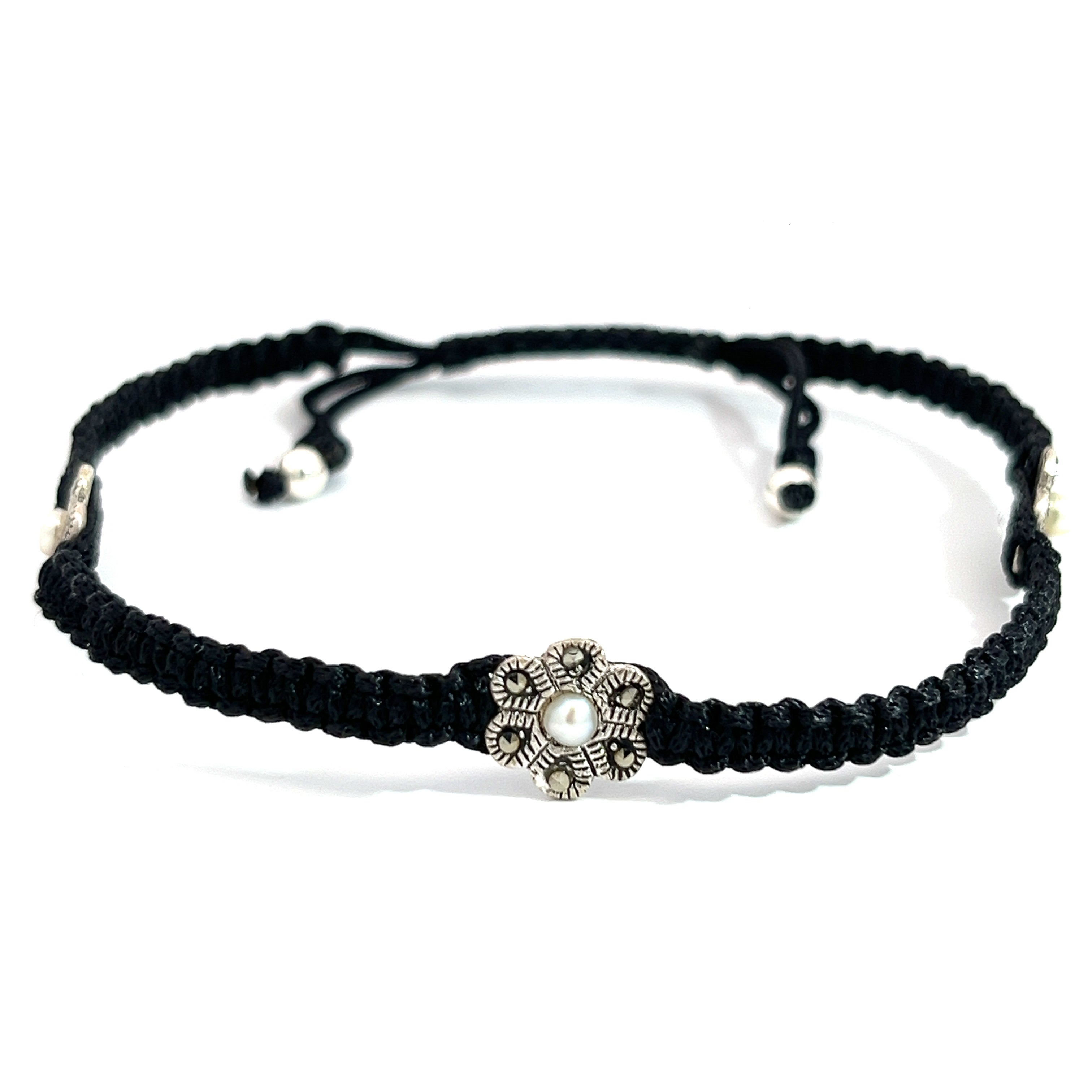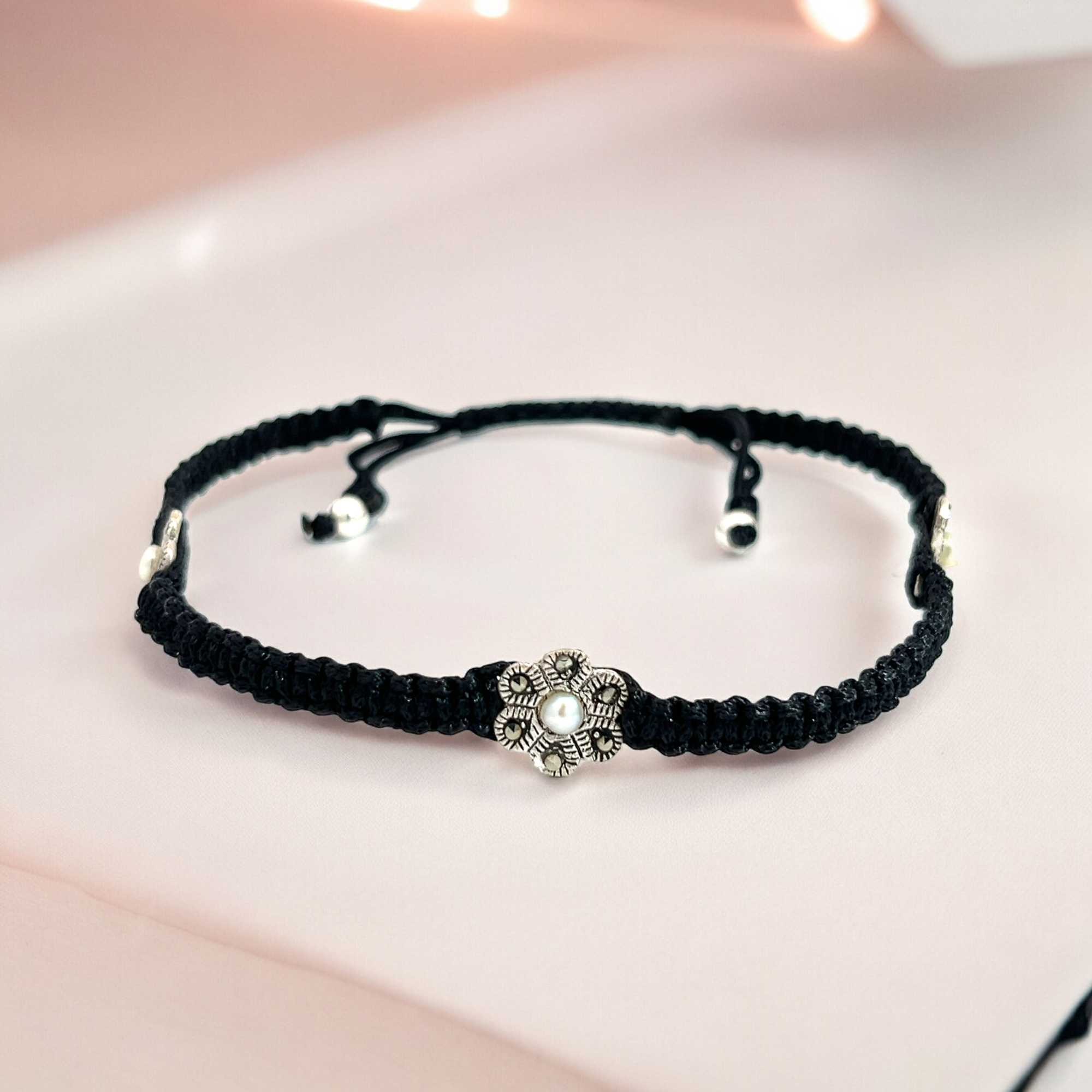 This stylish black anklet features a beautifully intricate floral design perfect for adding a touch of sophistication to any outfit. the adjustable cord ensures a perfect fit making it a perfect accessory for everyday wear.
