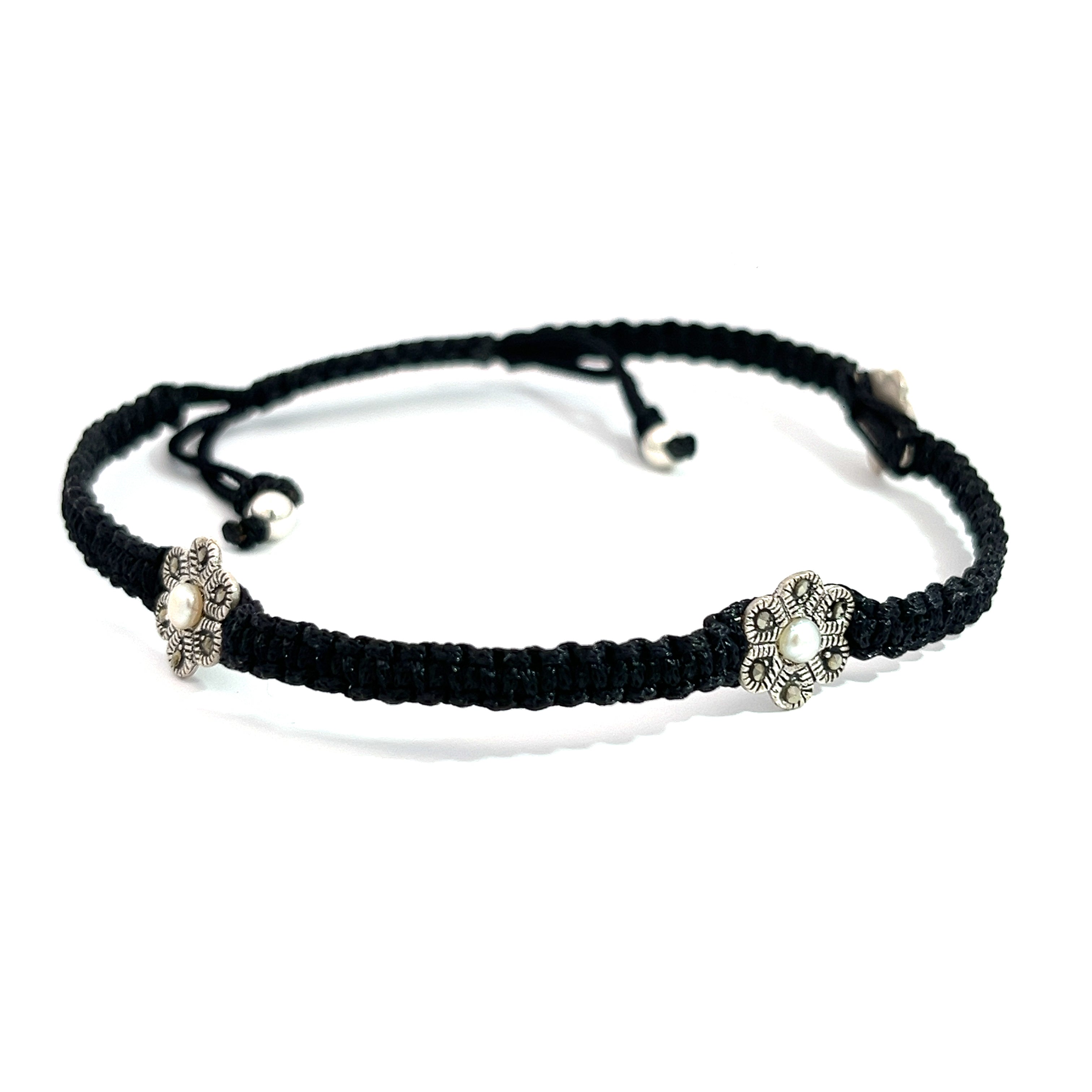 Floral Black Thread Silver Anklet