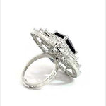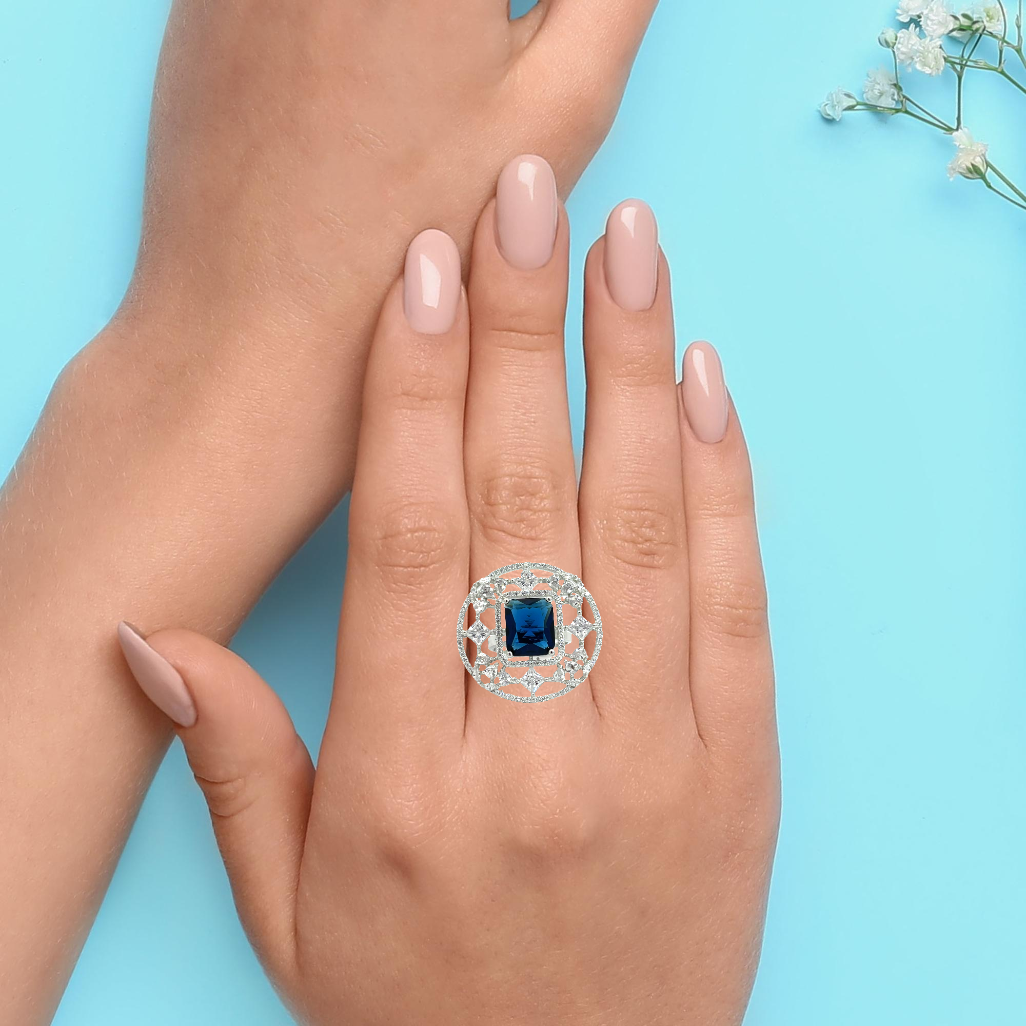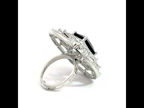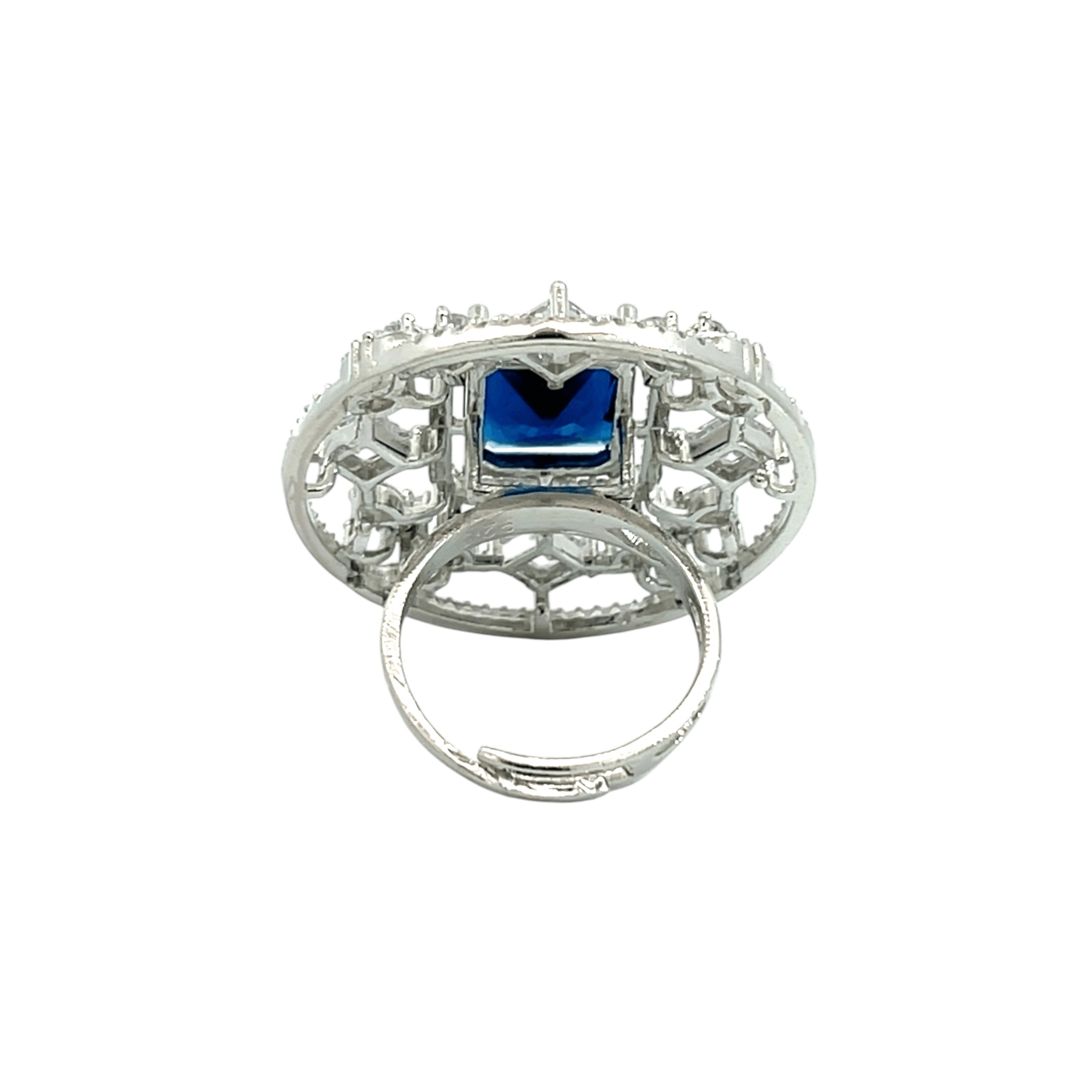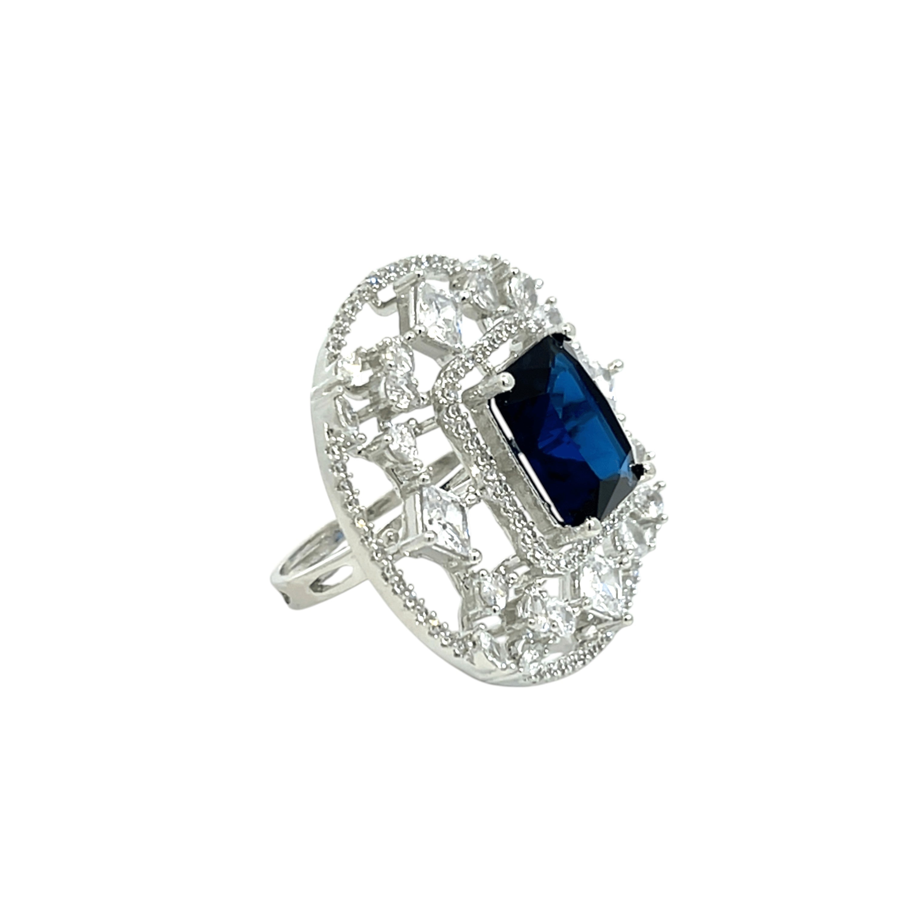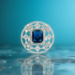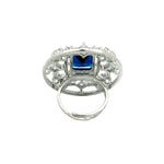 This exquisite silver ring is a showstopper, featuring a brilliant, deep sapphire blue stone at its centre. The large, radiant rectangular stone is encircled by a dazzling halo of smaller, intricately set white cubic zirconia, creating a stunning contrast. This ring is a statement piece perfect for special occasions or adding a touch of glamour to your everyday style.