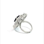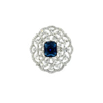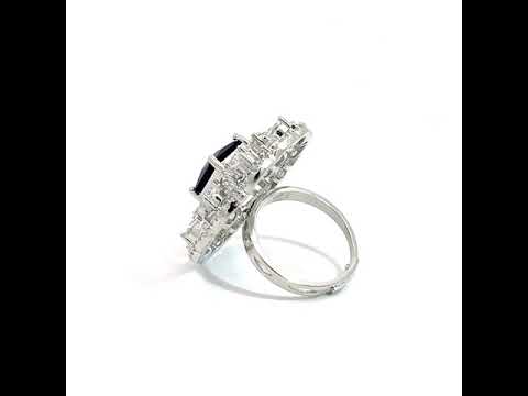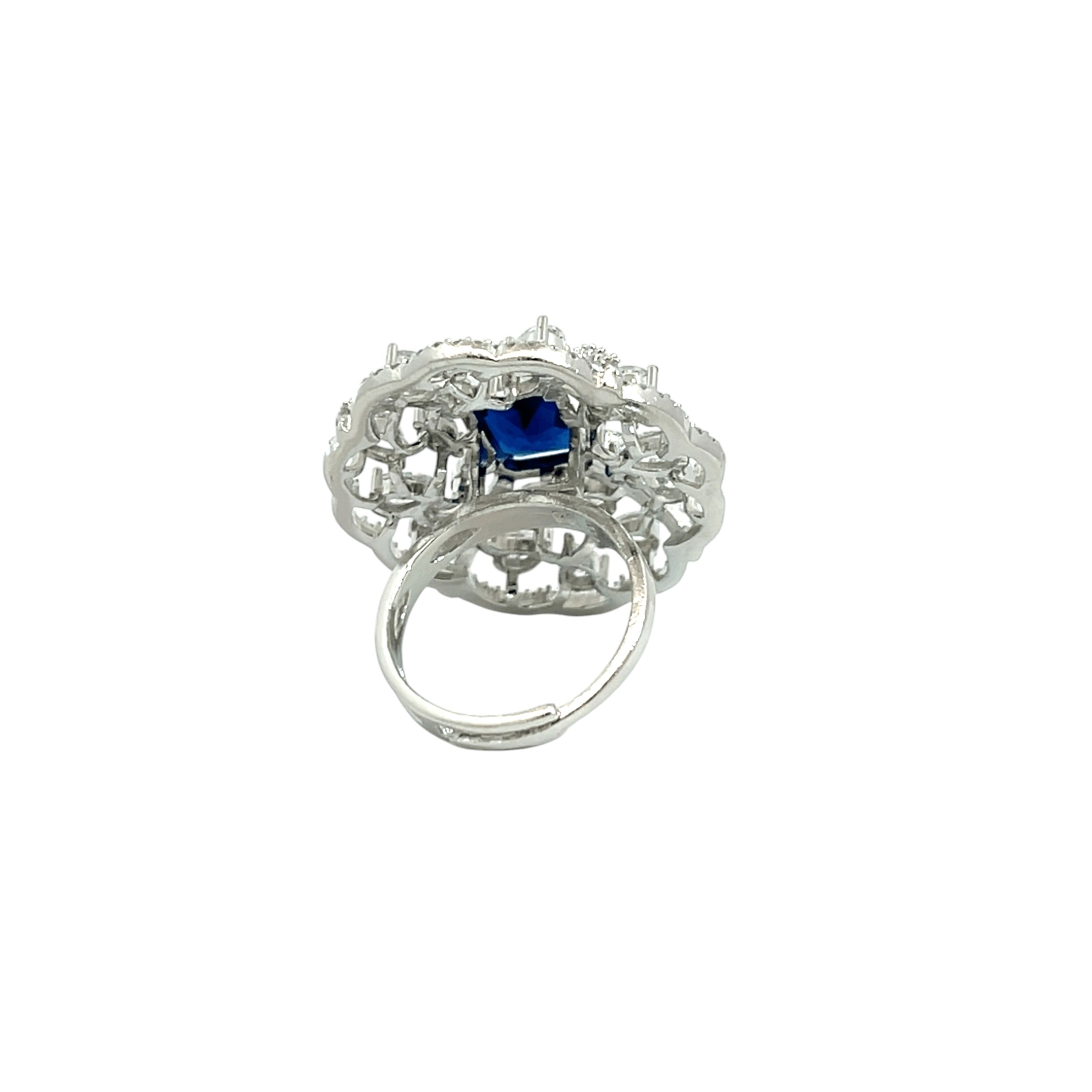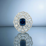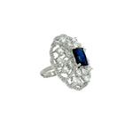This striking silver ring is a masterpiece of intricate design and brilliant sparkle. It features a central deep blue stone with a radiant rectangular cut. The center stone is beautifully framed by a delicate filigree pattern of interwoven swirls, creating a dynamic and elegant flower-like pattern. Crafted from polished silver, this ring offers a luxurious and vintage-inspired look perfect for making a sophisticated statement.