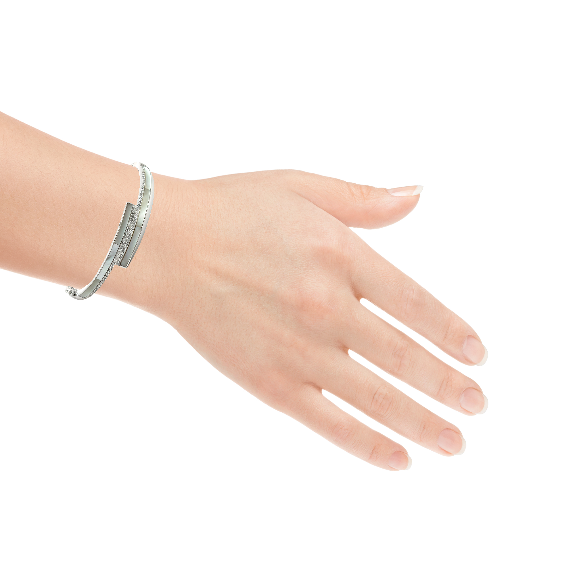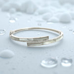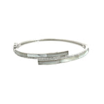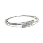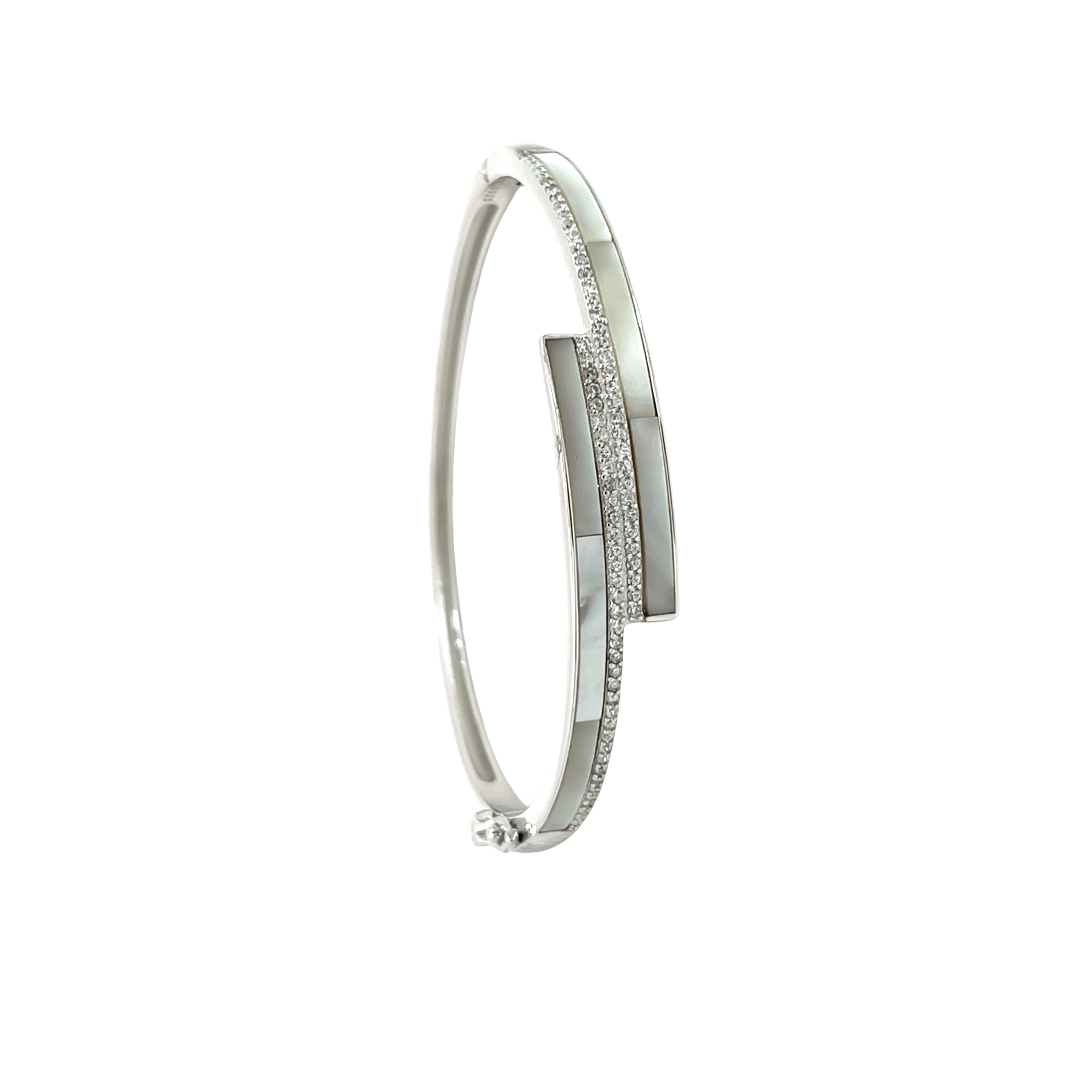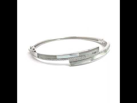 Introducing this stunning bracelet that combines modern elegance with classic sophistication. The bracelet features a striking geometric arrangement of two parallel bars. One is meticulously inlaid with smooth, iridescent mother of pearl, while the other is adorned with a dazzling row of pavé-set cubic zirconia. Whether worn for a special occasion or to elevate your everyday style, this bracelet is sure to make a statement.