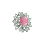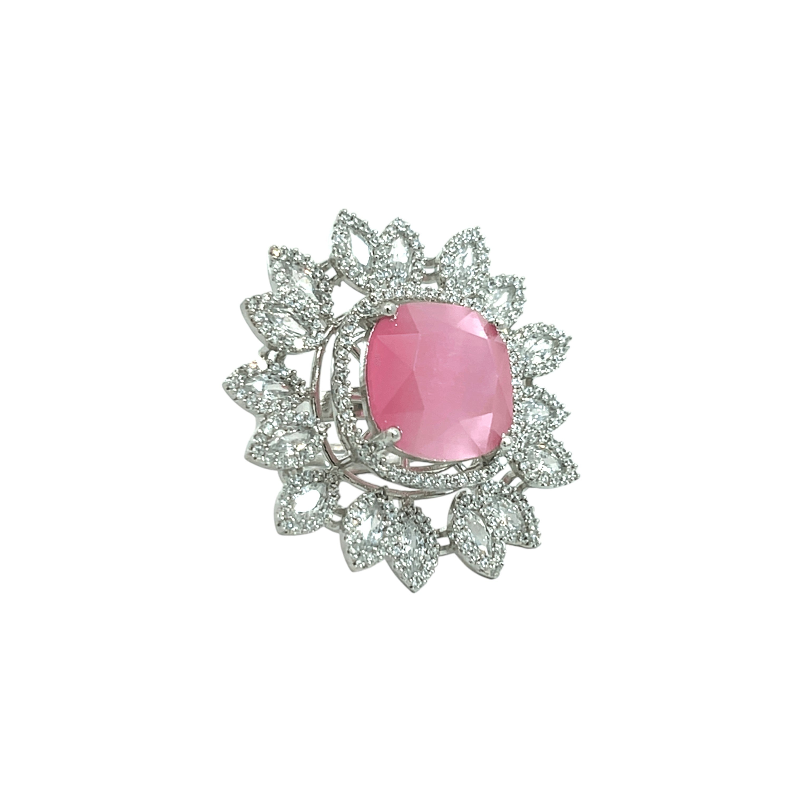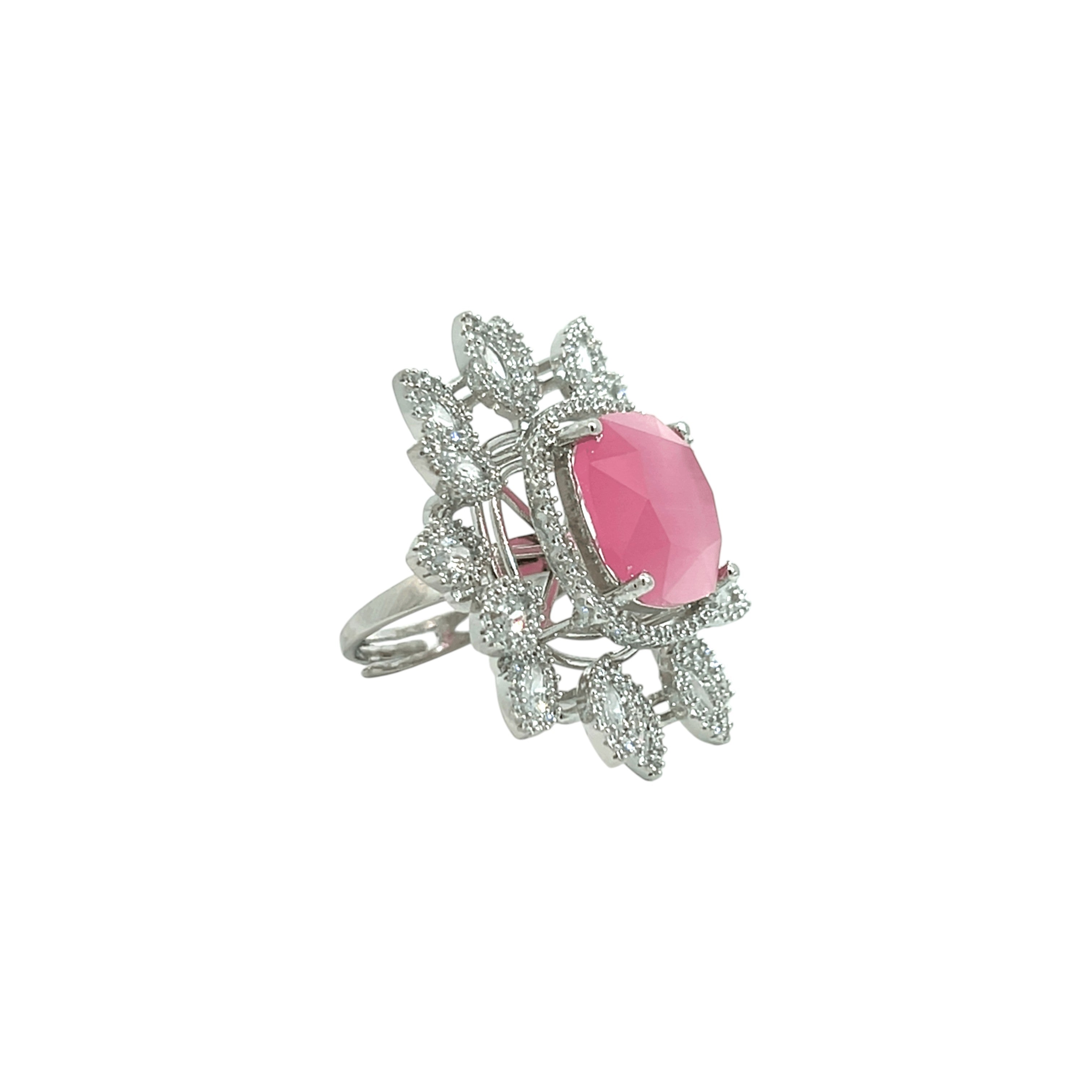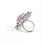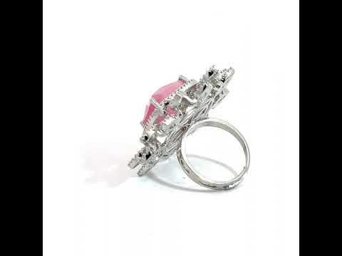 This captivating ring is a true statement piece, featuring a large, luminous pink stone at its centre. The soft, pearlescent pink is beautifully contrasted by dazzling zircon stones, arranged like sun rays. This ring is perfect for anyone looking to add a touch of unique elegance and vibrant colour to their jewelry collection.