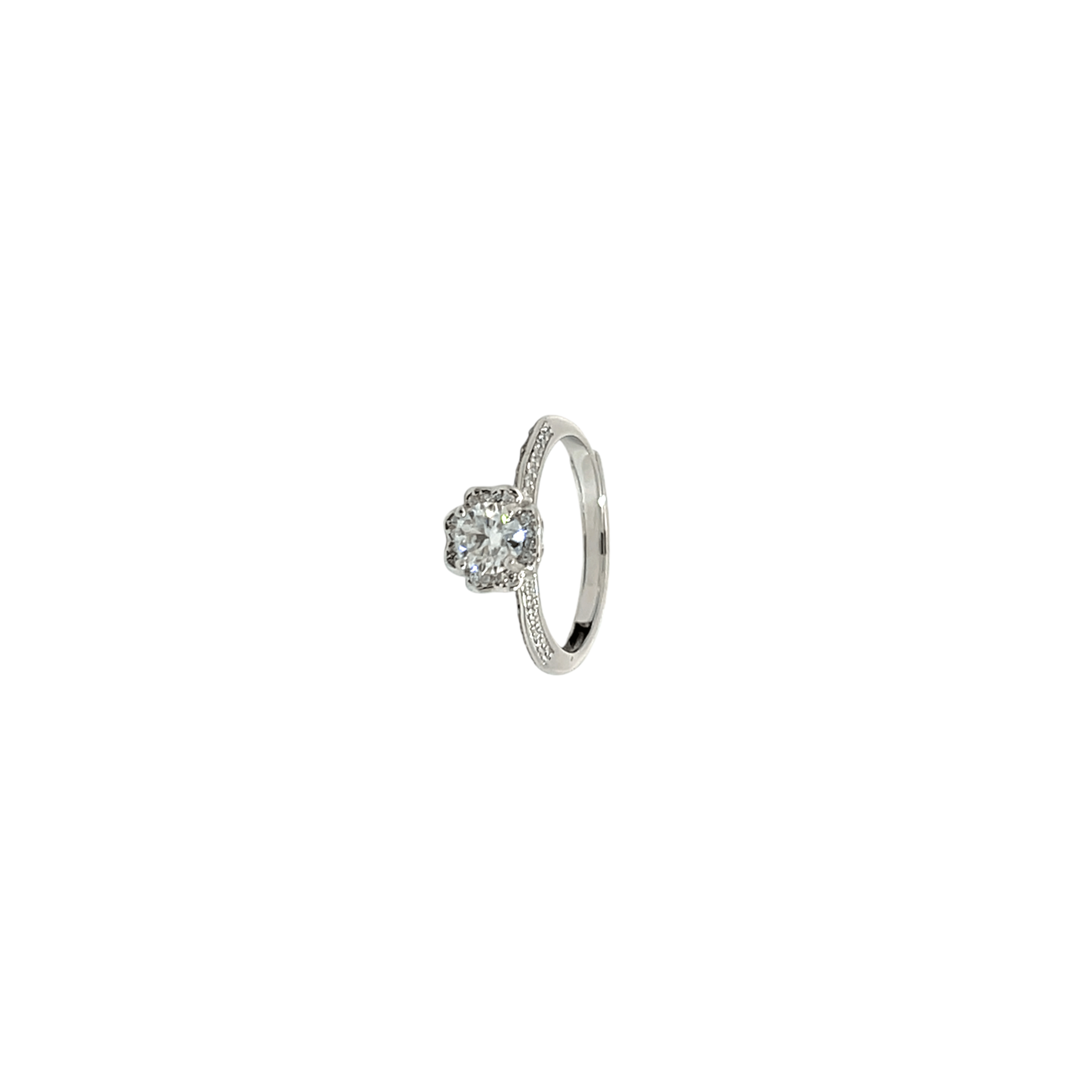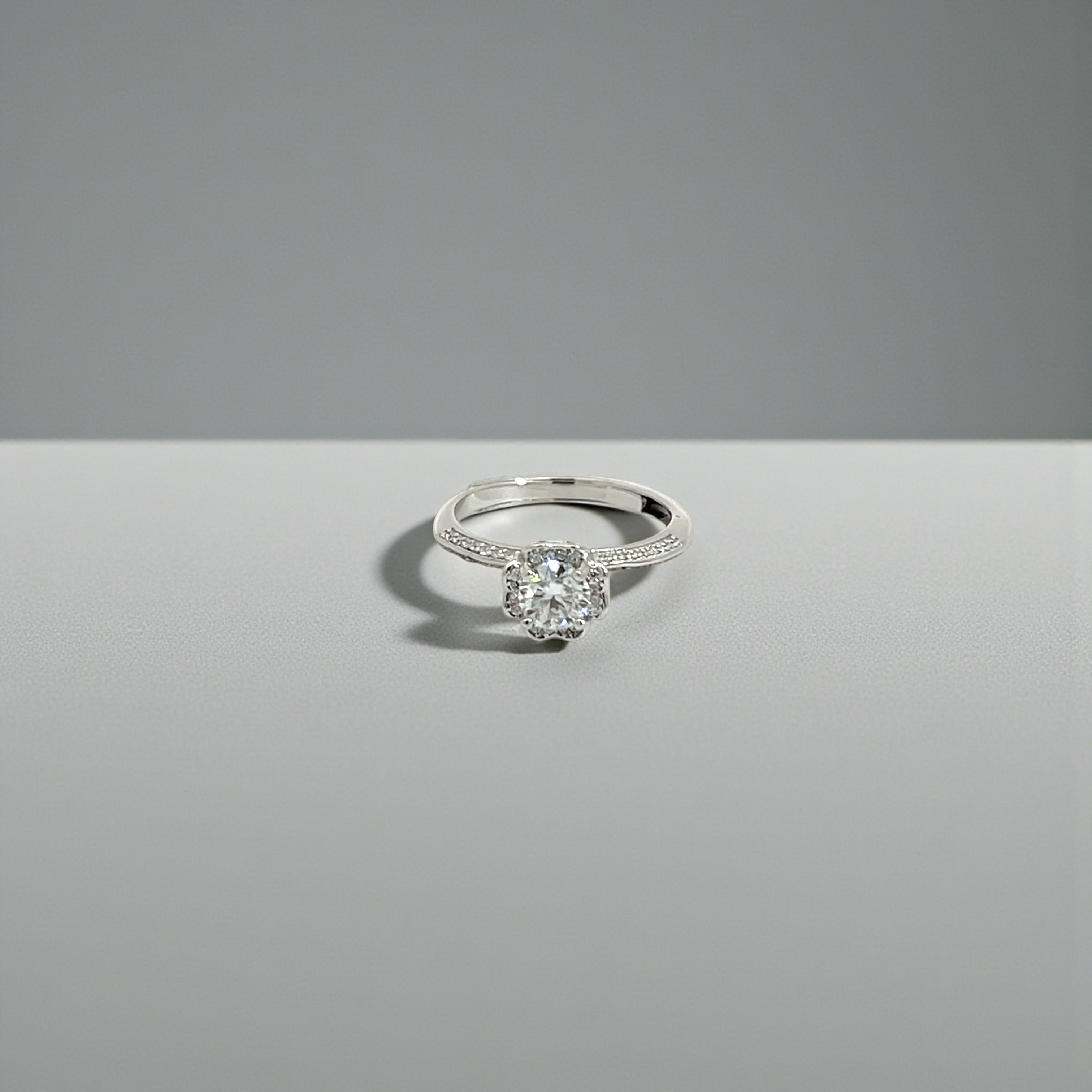 A silver solitaire ring features a single gemstone set in a silver band. It's a timeless piece, often used for engagements or as a statement accessory.